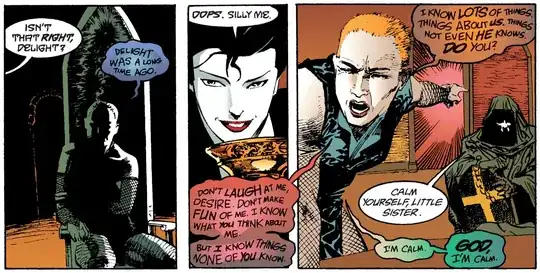 However, when Desire provokes Delirium (by calling her "Delight"), the speech bubbles take a darker hue (page 17):