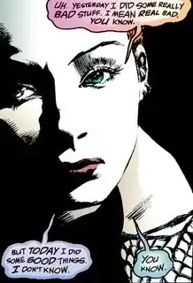 Todd Klein, the series' letterer, draws her speech as a scrawl, against a multi-colored background, sometimes the background color will match the mood she is in (red for anger, blue and green for calm, etc.).