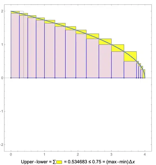 In the figures above (based on Newton's pre calculus book, Principia, Bk. I, Lemma III), the yellow rectangles show the difference between the maximum and minimum choices of the heights of the bits. The worst-case error is bounded by the sum of the areas of the yellow rectangles. The change the figure from the left to the right shows what happens if the third bit is divided. The large rectangle on the left becomes two smaller rectangles on the right. In effect, the large was divided into four, and two of the pieces were thrown away. As each bit is divided again and again, the yellow error bound get smaller and smaller: