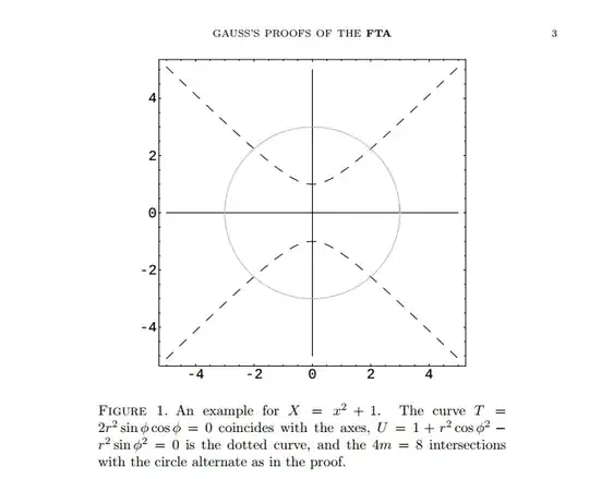 It remains to justify "we must end up somewhere, and this somewhere can only be on the boundary of the disc". First, observe that by Cauchy-Riemann equations, every critical point $a$ of $T$ is a zero of $p'$ (say, of multiplicity $k$), which means that there are only finitely many of them, and locally, the set $T=0$ near $a$ consists of $2k+2$ smooth curves ensuing from $a$ at equal angles (look at the leading term of Taylor expansion at $a$). Now, we can consider the maximal initial segment of the curve $\gamma$ starting at $\eta_1$ such that all the points on that segment are not critical (this segment is a simple curve), and a sequence $z_1,z_2,\dots$ of points that escapes any smaller initial segment. If this sequence is unbounded, then this initial segment crosses $|z|=R$, and we are done. Otherwise, we may pass to a subsequence and assume that $z_k\to z_0$, which by maximality must be a critical point. But then we can continue $\gamma$ from there, say, by going straight, and ask for the new maximal segment, and in a finite number of steps the process terminates. Isn't it exactly what Gauss claimed: "algebraic curve either comes back on itself or it goes to infinity on both sides"?