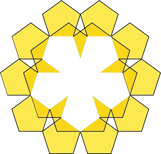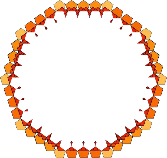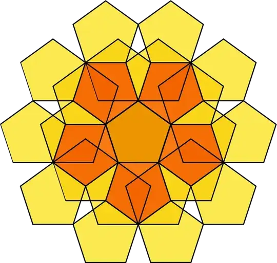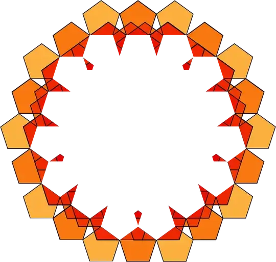 Here are the pentagons which arise from starting with the central green one and doing the reflections which do not overlap any previous ones.