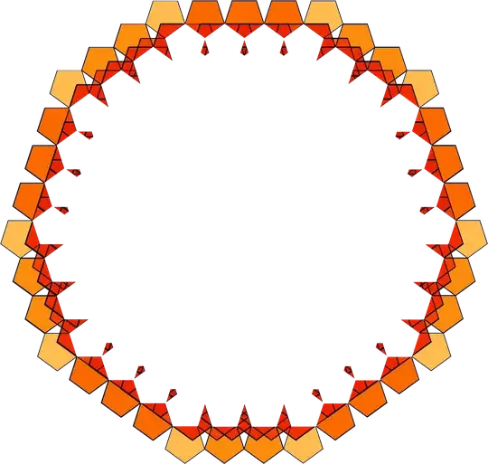 From these images, the following patterns are apparent: the "outer frontier" of $C_k$ is determined by a closed chain of $5k$ pentagons joined vertex to vertex. When $k$ is odd, these pentagons are all "down-pointing" and when $k$ is even they all are "up-pointing". From now on assume $k\geq2$. Then the pentagon chain is formed from 10 "segments of pentagons", which I'll call pentasegments, joining 10 corner pentagons where the pentasegments change direction.