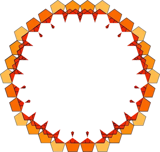 • The orientations of the line segments forming $C_k$ (measured relative to the $+x$ ray) when $k$ is even (odd) take the form $\pi m/5$ with $m$ an odd (even) integer; this is because pentagons are glued to each other in only two orientations (up-pointing or down-pointing) and furthermore, we can only glue down-pointing pentagons to up-pointing ones and vice versa. (Note also that no line segments of $C_k$ lie on $C_{k+1}$).