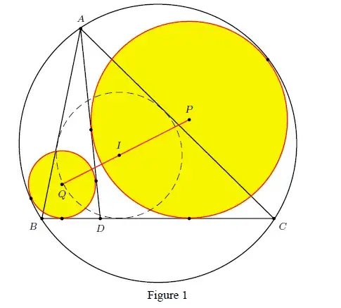 Problem 2: ( See Figure 2). Let $ABC$ be a triangle the red circle through $B$, $C$, the blue circle tangent to $AB$, $AC$ and the red circle. Let $P$ be arbitrary point in the plane, through $P$ construct two tangent lines $PD$, $PE$ to the blue circle. Let $(O_1)$ is the yellow circle tanegnt to the right tangent line $PD$, tangent to the red circle and the sideline $BC$; $(O_2)$ is the yellow circle tanegnt to the left tangent line $PF$, tangent to the red circle and tangent to the sideline $BC$. Then three points $O_1O_2$ through a fixed point when $P$ be moved on a given line.