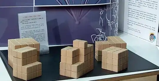 The following identity is a bit isolated in the arithmetic of natural integers $$3^3+4^3+5^3=6^3.$$ Let $K_6$ be a cube whose side has length $6$. We view it as the union of $216$ elementary unit cubes. We wish to cut it into $N$ connected components, each one being a union of elementary unit cubes, such that these components can be assembled so as to form three cubes of sizes $3,4$ and $5$. Of course, the latter are made simultaneously: a component may not be used in two cubes. There is a solution with $9$ pieces.