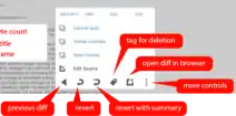 SWViewer control bar in expanded state - Control-bar - Control bar is by which actions are performed with tool. It includes back button, rollback, rollback with summary, speedy deletion, open diff in browser and more options. More options includes edit source, link to article history, GUC link for IP and accounts, CentralAuth link for accounts and links to noticeboards used to report for small wikis.