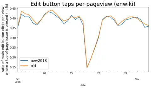 Also, this ratio of edit button taps saw large changes over time during the experiment for both test and control (i.e. not due to the page issues feature). In particular, four of the five wikis saw a sharp drop on October 19, for reasons that are so far unknown.