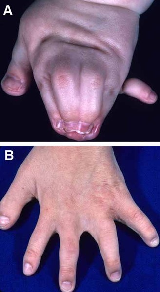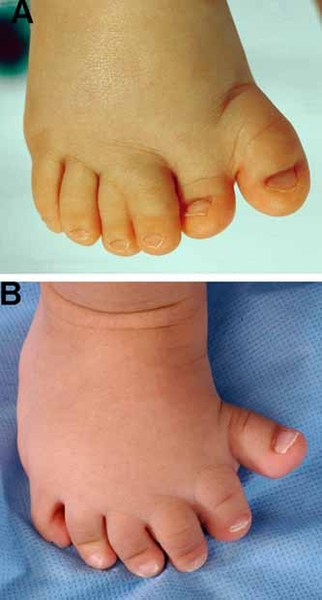 Extra fingers and toes are common in people with acrocallosal syndrome. The extra digits can be on the same side of the hand or foot as the pinky or little toe (postaxial polydactyly) or on the same side as the thumb or great toe (preaxial polydactyly). Some affected individuals also have webbed or fused skin between the fingers or toes (syndactyly).