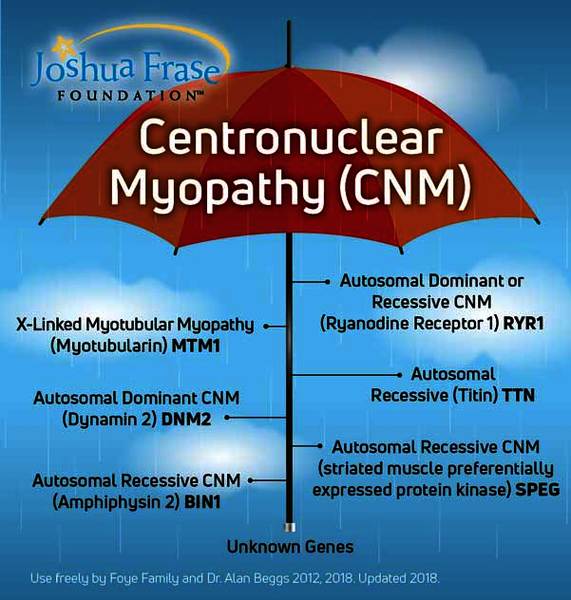 Some people with centronuclear myopathy do not have identified mutations in the DNM2, BIN1, or TTN genes. Mutations in other genes associated with this condition are found in a small percentage of cases. Some males with signs and symptoms of severe centronuclear myopathy may have a condition called X-linked myotubular myopathy, which is similar to centronuclear myopathy, and is often considered a subtype of the condition, but has a different genetic cause. In some people with centronuclear myopathy, the cause of the disorder is unknown. Researchers are looking for additional genes that are associated with centronuclear myopathy.