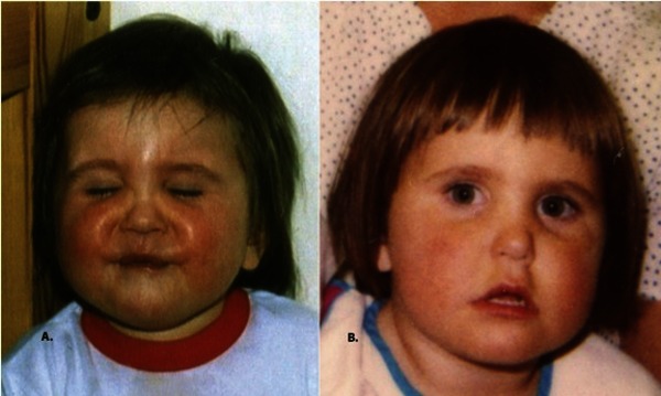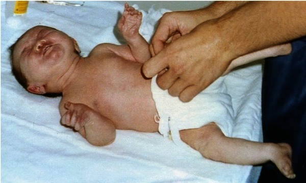 Infants with Crisponi syndrome have unusual facial features, including a flat nasal bridge, upturned nostrils, a long space between the nose and upper lip (philtrum), a high arched roof of the mouth (palate), a small chin (micrognathia), and low-set ears. The muscles in the lower part of the face are weak, leading to severe feeding difficulties, excessive drooling, and breathing problems. Other physical abnormalities associated with Crisponi syndrome include a scaly skin rash, an inability to fully extend the elbows, overlapping fingers and tightly fisted hands, and malformations of the feet and toes. Affected infants startle easily and often tense their facial muscles into a grimace-like expression. By six months of age, infants with Crisponi syndrome develop unexplained high fevers that increase the risk of seizures and sudden death.