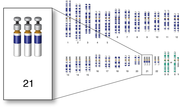 Less commonly, Down syndrome occurs when part of chromosome 21 becomes attached (translocated) to another chromosome during the formation of reproductive cells (eggs and sperm) in a parent or very early in fetal development. Affected people have two normal copies of chromosome 21 plus extra material from chromosome 21 attached to another chromosome, resulting in three copies of genetic material from chromosome 21. Affected individuals with this genetic change are said to have translocation Down syndrome.