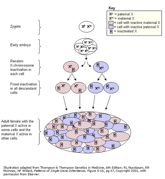 . Early in embryonic development in females, one of the two X chromosomes is permanently inactivated in somatic cells (cells other than egg and sperm cells). X-inactivation ensures that females, like males, have only one active copy of the X chromosome in each body cell. Usually X-inactivation occurs randomly, such that each X chromosome is active in about half of the body's cells. Sometimes X-inactivation is not random, and one X chromosome is active in more than half of cells. When X-inactivation does not occur randomly, it is called skewed X-inactivation.