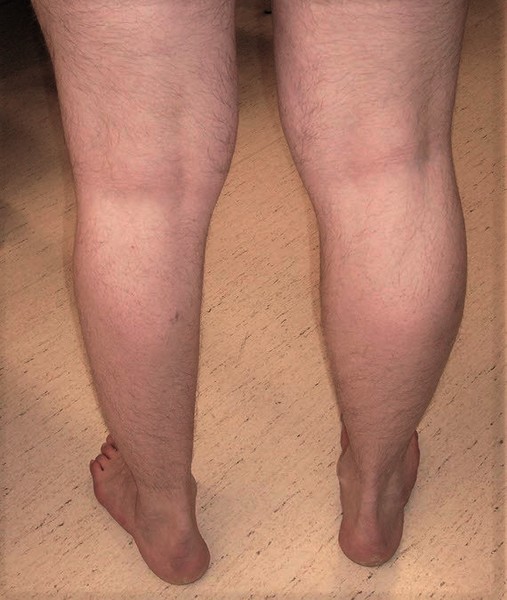 Miyoshi myopathy is a muscle disorder that begins with weakness in the muscles that are located away from the center of the body (distal muscles), such as those in the legs. During early to mid-adulthood, affected individuals typically begin to experience muscle weakness and wasting (atrophy) in one or both calves. If only one leg is affected, the calves appear different in size (asymmetrical). Calf weakness can make it difficult to stand on tiptoe.