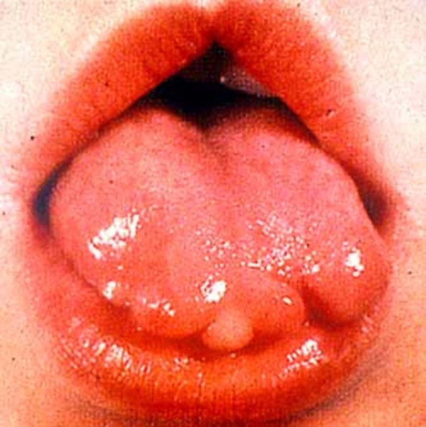 Abnormalities of the oral cavity that occur in many types of oral-facial-digital syndrome include a split (cleft) in the tongue, a tongue with an unusual lobed shape, and the growth of noncancerous tumors or nodules on the tongue. Affected individuals may also have extra, missing, or defective teeth. Another common feature is an opening in the roof of the mouth (a cleft palate). Some people with oral-facial-digital syndrome have bands of extra tissue (called hyperplastic frenula) that abnormally attach the lip to the gums.