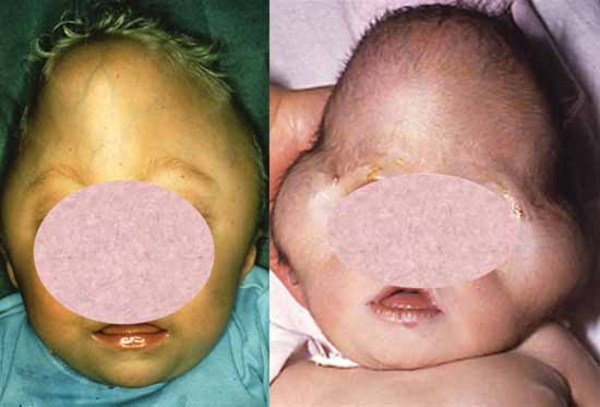 In people with osteoglophonic dysplasia, bones in the skull often fuse together too early (craniosynostosis). The craniosynostosis seen in people with this disorder may give the head a flat appearance or a "cloverleaf" shape, depending on which bones fuse first. Characteristic facial features in people with osteoglophonic dysplasia include a prominent forehead, widely spaced eyes (hypertelorism) that are prominent (proptosis), low-set ears, a flattening of the bridge of the nose and the middle of the face (midface hypoplasia), a protruding jaw (prognathism), a high arch in the roof of the mouth (a high-arched palate), and a short neck. People with this condition usually have no visible teeth because the teeth never emerge from the jaw (clinical anodontia). In addition, the gums are often overgrown (hypertrophic gingiva).