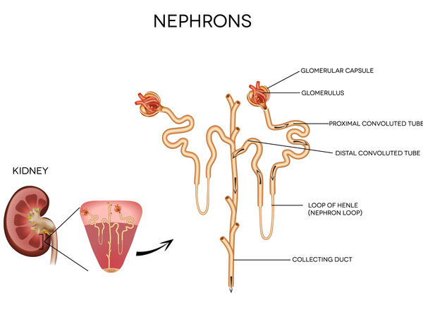 The V-ATPase that includes subunits produced from the ATP6V1B1 and ATP6V0A4 genes is found in the inner ear and in nephrons, which are the functional structures within the kidneys. Each nephron consists of two parts: a renal corpuscle (also known as a glomerulus) that filters the blood, and a renal tubule that reabsorbs substances that are needed and eliminates unneeded substances in urine. The V-ATPase is involved in regulating the amount of acid that is removed from the blood into the urine, and also in maintaining the proper pH of the fluid in the inner ear (endolymph).