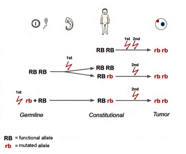 In hereditary retinoblastoma, mutations in the RB1 gene appear to be inherited in an autosomal dominant pattern. Autosomal dominant inheritance means that one copy of the altered gene in each cell is sufficient to increase the risk of cancer. A person with hereditary retinoblastoma may inherit an altered copy of the RB1 gene from one parent, or the altered gene may be the result of a new mutation that occurs in an egg or sperm cell or just after fertilization. For retinoblastoma to develop, a mutation involving the other copy of the RB1 gene must occur in retinal cells during the person's lifetime. This second mutation usually occurs in childhood, typically leading to the development of retinoblastoma in both eyes.