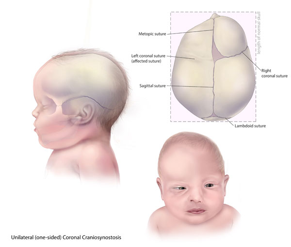 Most people with Saethre-Chotzen syndrome have prematurely fused skull bones along the coronal suture, the growth line that goes over the head from ear to ear. Other parts of the skull may be malformed as well. These changes can result in an abnormally shaped head, a high forehead, a low frontal hairline, droopy eyelids (ptosis), widely spaced eyes, and a broad nasal bridge. One side of the face may appear noticeably different from the other (facial asymmetry). Most people with Saethre-Chotzen syndrome also have small, rounded ears.