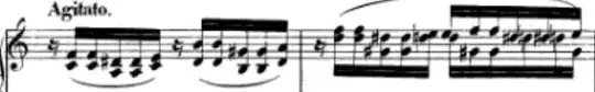 Here are two different screen shots of the same bit of music, from the beginning of the coda in Chopin's second Ballade. You can see clearly that the passage has groups of doubled 16th notes. If you look at the last 16th note of the first barred group in the second measure (a D with a natural mark and an E) it will probably be obvious from the context that these notes are to be played together.