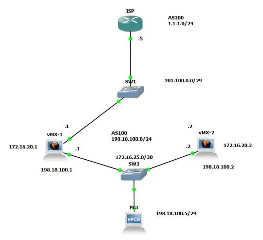 - ISP router with loopback of 1.1.1.1/32. Announcing route 1.1.1.0/24 via BGP to vMX-1. BGP session to vMX-2 not configured;