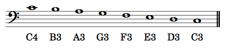 And a descending scale from middle C contains the following pitch designations: