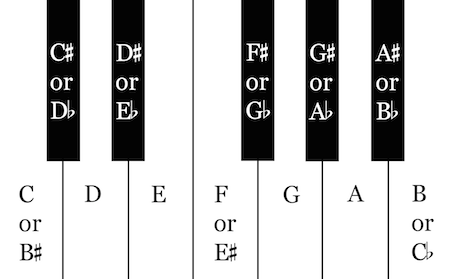 Notice that some of the keys have two names. When two pitch classes share a key on the keyboard, they are said to have enharmonic equivalence. Theoretically, each key could have several names (the note C could also be considered D♭♭, for instance), but it’s usually not necessary to know more than two enharmonic spellings.