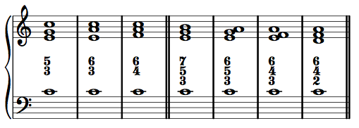 Only seven figures are given above. If you see a figure you do not recognize, simply follow the intervals (using the two shortcut rules). Likewise, if analyzing a chord that is not a triad or seventh chord, simply label the simple intervals you see/hear above the bass, from top to bottom in descending order: 7/6/3 or 5/4, for example. In time, you will become familiar with a number of other harmonic possibilities, and their corresponding figures.