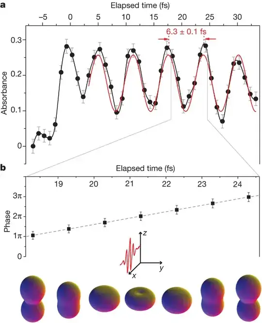 but they lead to clear oscillations in the signal (with the graph below showing the overall decay, and the oscillations on top of an exponential background) at a very short timescale that is only observable thanks to the availability of attosecond pulses.