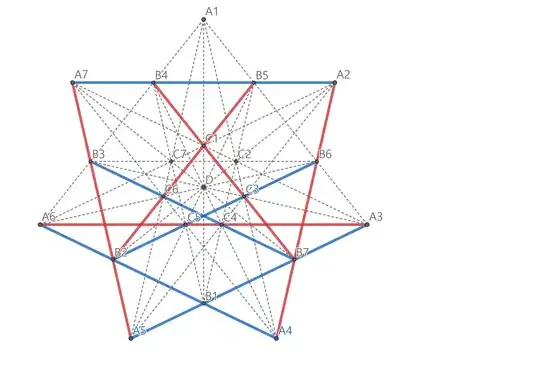 In the diagram, there are three regular heptagons that share the center. Let's call the vertices of the largest one $A_i$, the second largest $B_i$, and the smallest $C_i$, with $1 \le i \le 7$, and the center itself $D$. The vertices are numbered so that $A_i, B_i, C_i, D$ are collinear. Also, let's write the numbers written on each point in lowercase, i.e. $a_i, b_i, c_i, d$. The "solution" above contains an image with this way of labeling.