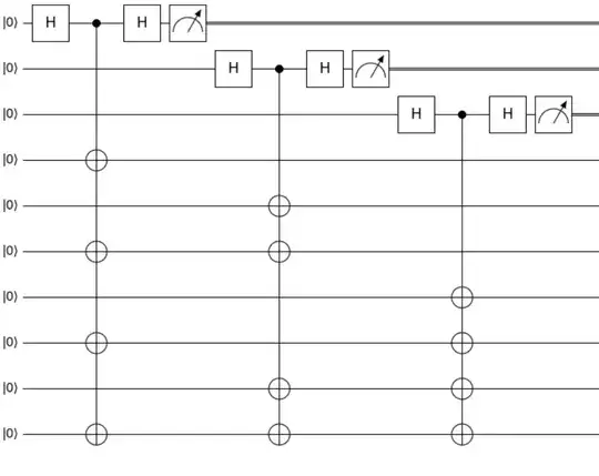 or in a more compact form (the circuits are constructed via quirk). The first three qubits are ancillary qubits and the rest are the qubits where $|0_L\rangle$ will be created if after the measurements all ancillary qubits are in the $|000\rangle$ state, otherwise one should repeat the procedure until the desired measurement result will be archived.