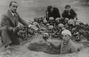 Furthermore, it is usually conveniently forgotten by Turkish apologists that a significant portion (in fact, probably a majority) of Muslim deaths in Anatolia during the First World War were caused by seizures of property and food by the Ottoman government, which even forced Muslim poor and peasants to be worked to death in forced labor gangs (along, of course, with Christians).[29] Similarly, the massive quantities of dead bodies from victims of genocide lead to considerable Muslim deaths from disease due to all the rotting flesh.[30] The amnesia over these events, with the corresponding shift of blame onto "Armenian gangs", is therefore a convenient method of hiding embarrassing and unappetizing history. Additionally, Turkish historians have taken to exhuming the mass graves of dead Armenians slaughtered in the genocide and portraying these as corpses of Muslims in order to pretend the perpetrators of the genocide were in fact its victims.[27]