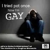 While a quick 10-second cursory glance at the page would quickly reveal the site was obviously satire,[1] there were plenty of people who failed to do that, and as such fell for the less obvious satirical pieces. One of their most well known examples was the poster seen on the the right. The poster, with the fictitious back-story of Tad, the straight best friend who tried marijuana, became addicted, turned gay and died of AIDS, quickly gained in popularity. Despite the completely over-the-top nature of the back story, a hilarious number of folks took it seriously and acted as expected. It even caught the attention of Stephen Fry, who fell for the the joke hook, line and sinker, expressing his outrage on a Twitter post.[2] PZ Myers fell for the Tad story and blogged about it, but upon learning the truth he edited his entry.[3] David Draiman, lead singer of Disturbed, also fell for the parody. He was "outraged" by the Tad meme, as outlined in Twitchy.com's article showing numerous Twitter posts. Hundreds of fans tried to inform Draiman that it was a parody, but he was slow to admit he had been fooled.[4]