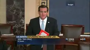 Under Woodrow Wilson's advice, the Senate introduced the "cloture" rule, which allows the Senate to end filibusters with a two-thirds vote.[64] It was used just a few years later when the Senate filibustered against the Treaty of Versailles. The cloture rule has been key to halting filibusters ever since, and it also played a pivotal role in in the Senate's passage of Obamacare during the brief period in which Barack Obama's party enjoyed a 60-vote majority.[66] Senator Ted Cruz in 2013 tried to shut down the government over Obamacare funding by filibustering for 21 hours 19 minutes, a speech in which he even opened a children's book to read to his daughters on the TV.[67] This speech helped cause the 2013 government shutdown.