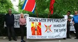 The group also leads activities in Western countries to protest the "unfair" treatment of the DPRK. The images of these protests would suggest that the KFA has more banners and flags than actual members.[10]