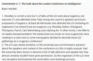 - While Woodley is correct that a very low percentage of talks at the LCI were about eugenics, virtually everyone who attended (even Toby Young, who wasn't a speaker) are known proponents of eugenics; at least all individuals who attended the LCI based on the 2015 and 2016 talk abstracts (including its organiser) are pro-eugenics. In other words, there was little to no media misrepresentation: the media knew two dozen or more eugenicists were meeting in a room and so some newspapers decided to describe the LCI gatherings as a "eugenics conference."[25]
