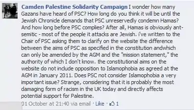 The Bristol branch of PSC is chaired by Cliff Hanley, who has also linked to videos by Lawson. In addition he has linked, apparently approvingly, to a now-defunct Facebook group which declared that "Judgment Day will be brought upon us only once the Muslims have killed all of the Jews".[6]