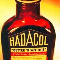 Possibly the most popular patent medicine of all time (discounting Coca-Cola, which long ago abandoned all medical pretenses) was a short-lived concoction called Hadacol, cooked up by Louisiana state Senator Dudley J. LeBlanc in 1950. The "tonic" contained some B vitamins and iron, plus a 12% alcohol "preservative", which made it a popular source of booze in dry counties. Hadacol was heavily advertised throughout the south, with radio endorsements by entertainers such as Hank Williams, and even had a promotional caravan, often regarded as the last of the travelling "medicine shows",[3] but ultimately went bust by the end of 1951, due to huge advertising and tax debts, and due to a federal-court decision ruling that the manufacturers' claims that Hadacol was "an effective treatment and cure for scores of ailments and diseases" were patently false and misleading. The name lives on as that of a Missouri-based Country Rock band.[4]