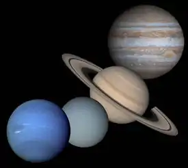 A gas giant is a large planet consisting of gases (predominantly hydrogen and helium) held together by gravitation, although many gas giants also have a solid rocky core and icy rings surrounding the equator (though aside from Saturn's impressive ring system, they tend to be rather small compared to the planet itself, which should be obvious since the image in this section doesn't show them clearly). Gas giants are one of three types of planets, the other being the rocky planets and ice giants.