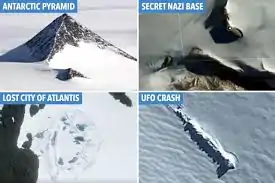 Since the first missions to Antarctica early in the 20th century, there have been stories about a mysterious pyramid discovered on the chilly continent near the south pole. British explorers in the early 1910s found a pointy rock and named it the Pyramid and included it on their maps; this rock has sometimes been the object of theories about secret pyramids despite it not being at all secret.[9] From 2012 to 2016 a new round of rumours spread, linked with photographs that show something apparently in Antarctica with regular triangular sides.[10] Skeptics have questioned the pictures, suggesting they may show a natural structure photographed in a particularly flattering way.[11]
