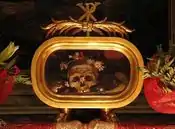 In Catholic theology, relics of saints are kept "in order the better to adore Him whose martyrs they are."[6] The Catholic Church separates relics into three classes.[7][8] First-class relics are items directly involved in the life of Christ or a martyr, or physical remains of a recognized Catholic saint. Second-class relics are important items in a saint's life, such as their crucifix, Bible, rosary, etc. Third-class relics are objects which have been touched to a second-class relic.