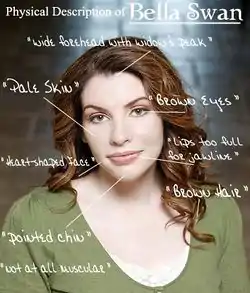 The Twilight series is, quite literally, Meyer's sexual fantasies set down on paper. Yes, really, Meyer confessed the idea of an "average girl" connecting with a sparkly, blood-sucking Adonis "came to her in a dream".[20] The wish fulfillment factor of the Twilight series most certainly isn't helped by the fact that it is "written" first-person from Bella's point of view (with the exception of "Book" Two of Breaking Dawn, which is "written" from Jacob's perspective). Very little physical description is given of Bella in the "books"; Meyer did this intentionally, ostensibly to allow readers to "more easily step into [Bella's] shoes."[21] This applies equally to the person responsible for writing the damn things. Meyer published a detailed physical description of Bella on her website,[21] which was apparently drawn largely from looking in the mirror (see right).