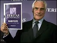 In 2004 the party paid £100,000 to publicist Max Clifford, who was later sentenced to 8 years in jail for a string of sexual assaults.[32][40] The next year, the party faced a new party rival: former Labour MP Robert Kilroy-Silk had contested the UKIP leadership in 2004 unsuccessfully and quit soon after, setting up a new party called Veritas; he was joined by a defecting UKIP London Assembly member in February 2005.[41] Led by the charismatic Kilroy-Silk,[42] Veritas was founded on an "[anti]-immigration ticket"[43] and shared Farage's right-wing populism; at this time Farage had not taken control of UKIP to fully radicalise the party, and Roger Knapman was leader. Knapman was disliked by many in UKIP for being regarded as a "mainstream" politician and refusing to contest parliamentary seats where there were Conservative Eurosceptic candidates, hence the party continued to be seen as too single-issue. After Kilroy-Silk's defection, UKIP's membership declined and it had to face competing against Veritas in the 2005 General election. Both focused on trying to win over anti-immigration voters,[44][45] but suffered from the rise of the British National Party who were performing much better than UKIP/Veritas in local council elections and parliamentary by-elections. In the 2005 General election, while fielding fewer candidates than UKIP, but more than Veritas, the BNP did better than both (in terms of vote %) in seats they contested.[46] This is despite the fact Kilroy-Silk's immigration policy for Veritas was almost as extreme as the BNP's: "immigrants must speak English, pass health tests, have no criminal convictions and integrate into the British way of life"; a 3-year moratorium (temporary ban) on immigration, while deporting all illegal immigrants.[47] During Veritas' manifesto launch in April 2005, Kilroy-Silk bizarrely described multiculturalism as "liberal fascism".[48]
