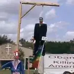 The second picture of the Effigy is from an earlier time when the pastor just hanged an Obama effigy infront of his church, during the 2012 presidential elections, from a June 8th, 2012 thesmolkinggun.com article:
