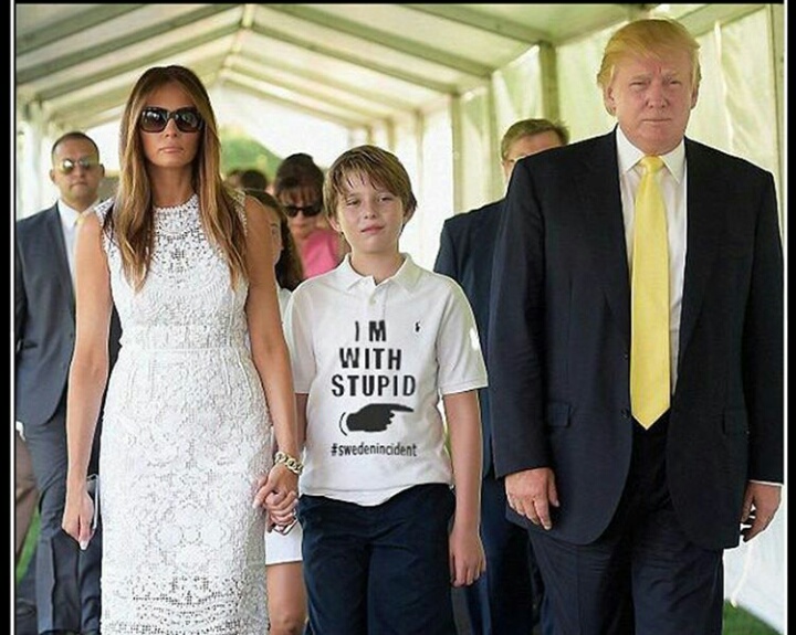 This image apparently shows Barron Trump standing next to his father, while wearing an "I'm With Stupid #swedenincident" shirt.