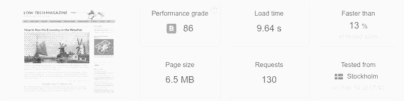 Le principal défi a été de réduire la taille de la page sans réduire l’attractivité du site. Comme les images consomment l’essentiel de la bande passante il serait facile d’obtenir des pages très légères et de diminuer l’énergie nécessaire en supprimant les images, en réduisant leur nombre ou en réduisant considérablement leur taille. Néanmoins, les images sont une part importante de l’attractivité de Low-tech Magazine et le site ne serait pas le même sans elles.