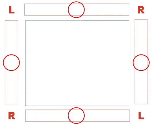 I have a theater show with a squared stage (blue). The spectators are sitting on every side of the stage (red squares). And 2 pairs of speakers to be positioned at the corners. The sound will be stereo signal (L/R) and my question is how to couple the speakers..basically where is the left and where is the right since there's no front/back? Is fig 1 better than fig 2? Suggestions?