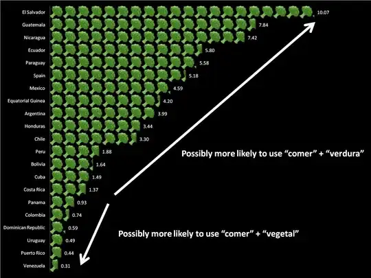 As you can see, in general, “comer verduras” is more common, but I wondered if that was dependent upon region, so I went to Google’s Advanced Search to run these same phrases through a search filtered by country and language (Spanish). What you see below is how many more times “comer verduras” was found on web pages than “comer vegetales.” Numbers below 1.00 indicate the reverse was true.
