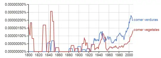 Since having written the above, I’ve been wondering how best to say something like, “I like to eat vegetables.” Should I use “vegetales” or “verduras?” So I ran a couple of phrases through Google’s Ngram. The results were as follows: