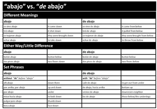 Now a question that may remain for some of you is, When do I use just "abajo" and when do I use "de abajo?" Good question and one you may have to just kind of learn as you go, but there are some tendencies and subtle changes between these two that you should at least be aware of. Overall, usage of "abajo" is far greater than "de abajo," but there will be times when "de abajo" is the phrase you need to use. After taking a look at some online news articles to see how "abajo" and "de abajo" were used, I noticed that they could sometimes be interchangeable, but instances of this were few. More often than not, I saw combinations of words that were what I guess you could call "set phrases" or perhaps just "collocations." Outside of those two categories, what I found were examples of phrases whose meaning changed with the presence or absence of "de" before "abajo." You can see what I mean in the chart below: