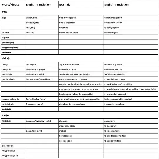 Regarding the chart immediately above, I revised the information on it for a few reasons. But before I get to that, let me explain its structure a bit. First off, I should mention that "bajo" is typically used as an adjective meaning "low." Even if my initial inquiry didn't explicitly state this, I was primarily interested in how these three words — bajo, debajo, and abajo — differed when used as prepositions or adverbs, so I didn't deliberately include examples for "bajo" as the adjective "low." However, because I initially thought "de bajo" was commonly used as an adverbial phrase, I included it. When I took a harder look at uses of "de bajo," though, it appeared that a lot of the time "de bajo" is part of an adjectival phrase. In addition to the example you'll now see in the chart above, you'll often see "de bajo" used in common phrases such as these:*